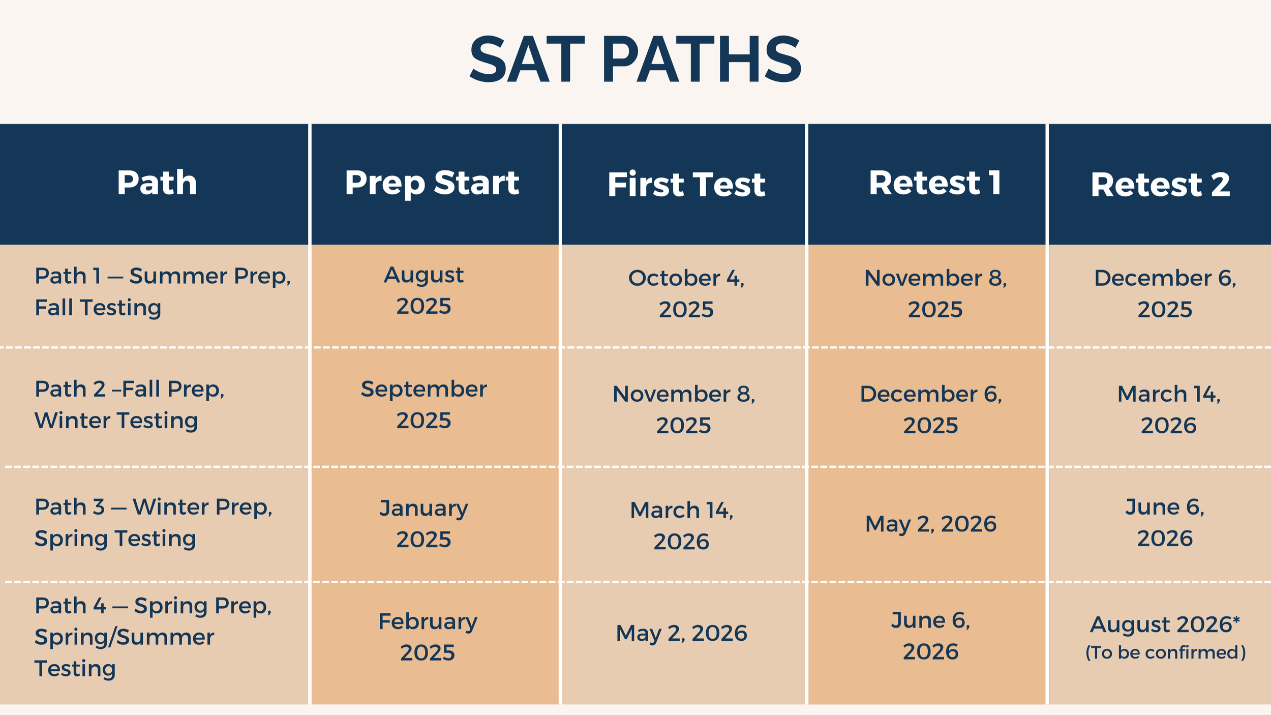 Below, you’ll see four clear SAT prep paths and four ACT prep paths, mapped to real test dates for the Class of 2027. These are flexible starting points — so you can see what’s possible and talk through what fits best for your student.